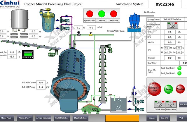 Xinhai Mining provides the Pakistan copper processing project two PLC control system for automatic control system. It mainly completes the crushing process and ball mill concentration control process signal acquisition and control. PC monitoring system has the centralized monitoring and control function operation, realize the dynamic display of the control process (various operation signal of motor current, material level, crushing equipment running status are displayed on the process diagram), the centralized control of equipment on the spot or single control, all kinds of data report, variable trend, operation records, alarm records query, and other functions.