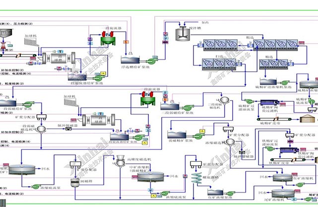 According to the production of mineral processing, online measuring instrument, controller, computer technology and automatic control method are applied for measuring, simulating, controlling and managing producing equipment and processing flow. Using optimized deployed labor to increase the product efficiency and product quality for the whole flow, reducing the production costs and increase the competitiveness of enterprise.