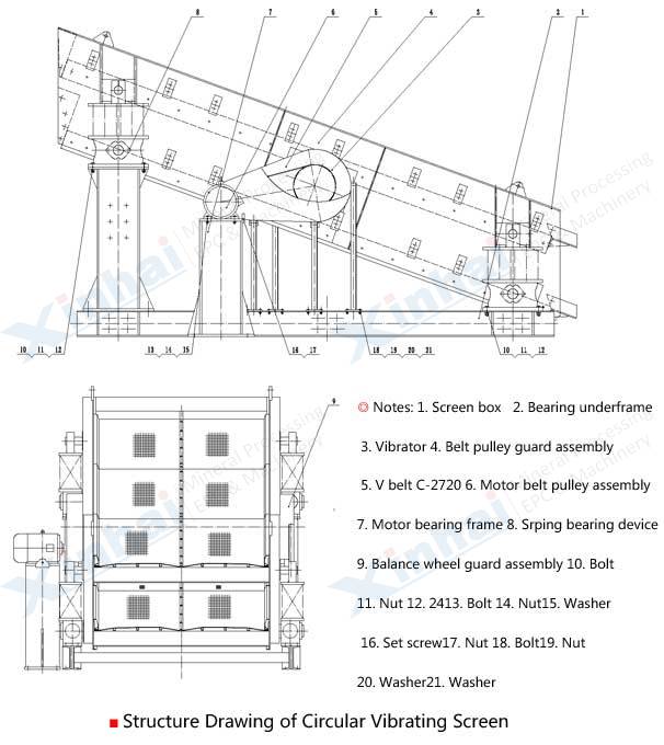 Round vibrating screen is applied in quarry for screening sandstone or for product classification of coal, mine, construction materials, electric power and chemical industry.