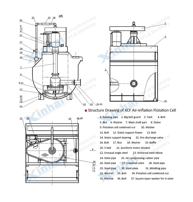 [Improvement]: The features of structure and performance of the cell is similar to KYF flotation cell. The difference is that there is a stator specially set above the impeller to form a special negative pressure area. It has the function of automatic suction slurry with a little higher energy consumption.