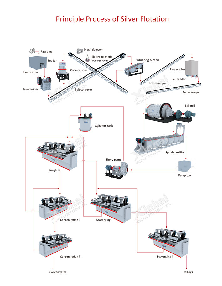 [Introduction]: Silver flotation process of Xinhai includes three kinds of methods: flotation, flotation &gravity separation, flotation &cyaniding, while the flotation & cyaniding method is the most important process among the whole, silver concentrate can be get in the process of flotation, then regrinding to the next process including cyaniding and leaching, countercurrent washing, zinc powder replacement and silver ingot can be finally get after the last process of electrolytic dissociation. Thus the process characterized by high recovery and economic benefits.