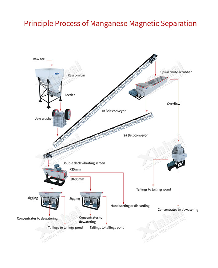 Xinhai adopts special high-intensity ;magnetic separator of manganese ore to remove impurities preliminary, then uses spiral classifier to classify rougher concentrate, rougher tailings directly discharge ;into the tailings thickener at last.