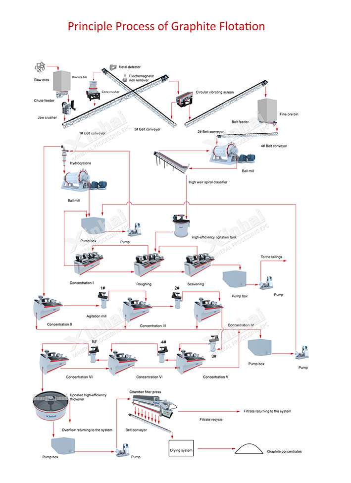 Xinhai usually applying multi-stage grinding process to protect graphite flake from damaged. Applying multiple grinding and separation to meet the customers needs. Hydrocyclone can be used at the thickening stage,which keep the grinding density at 40% to 50% for better grinding efficiency. At the multi-flotation stage, No.2 oil, No.4 oil, ether glycol and butyl ether oil are the common foaming agents. As for collectors, mainly use kerosene, diesel oil, heavy oil, fat sulfonic acid ester, acid,etc.