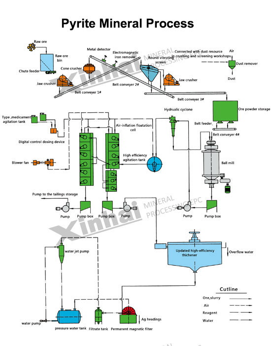Crushing, separating, grinding, classifying, flotation and concentrating is the main steps for flotation when processing pyrite.