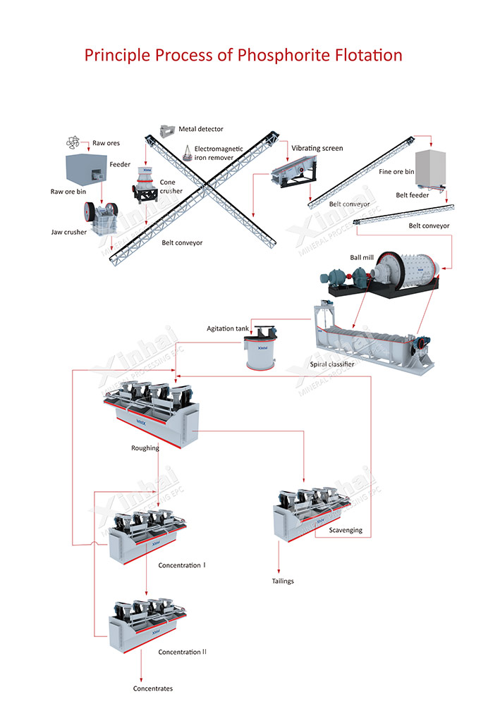 Direct flotation inhibits gangue minerals by effective inhibitors, and the phosphorus mineral is enriched in foam by collecting agent. This process is suitable for low grade phosphate ores including magmatite type apatite and sedimentary metamorphic type phosphorite ore